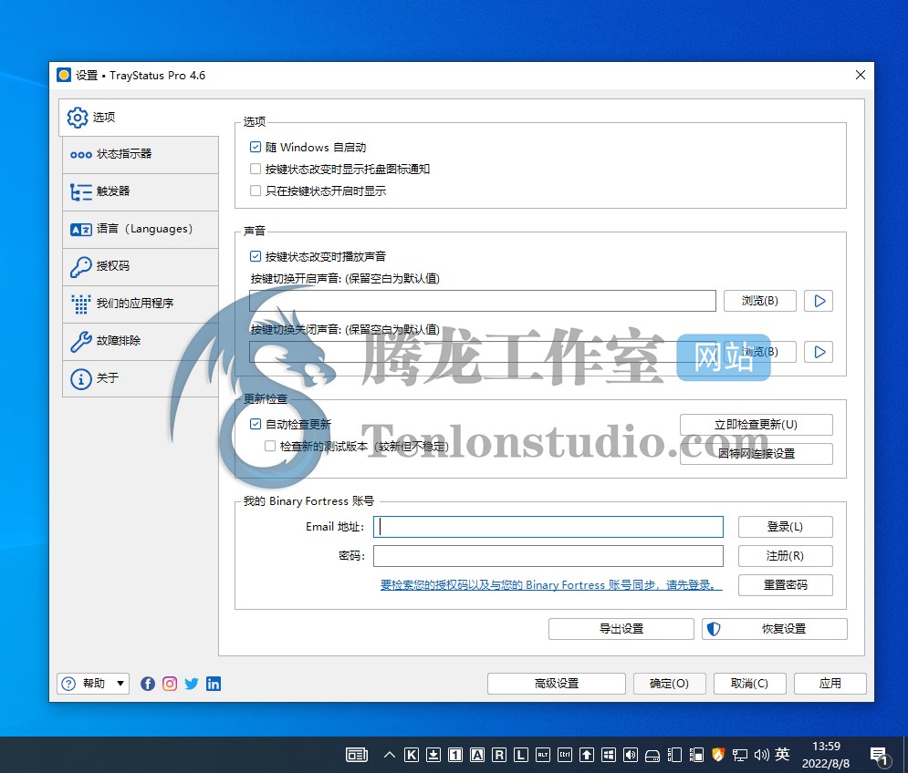 TrayStatus 在系统托盘中显示键盘键的状态,例如 Caps Lock、Num Lock、Scroll Lock、Alt、Ctrl 等。显示 CPU、内存或硬盘驱动器活动,或使用性能计数器来监控磁盘队列长度、网络活动、IIS 请求等内容。当特定应用程序或窗口被聚焦时,使用强大的触发器功能自动启用或禁用 Caps/Num/Scroll Lock。切换按键时播放声音或显示托盘通知。双击状态指示器以切换该键的锁定状态。使用内置的浅色或深色图标主题,或创建您自己的自定义图标主题以适合您的风格。TrayStatus 被翻译成许多不同的语言以便于使用。