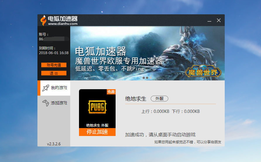 [title]电狐加速器是一款专门针对外服网络游戏的加速产品。能够有效解决玩家在游戏中遇到的各种延时、丢包、卡顿、掉线、登录等问题。5月30日-6月6日期间可免费加速绝地求生。[/title]