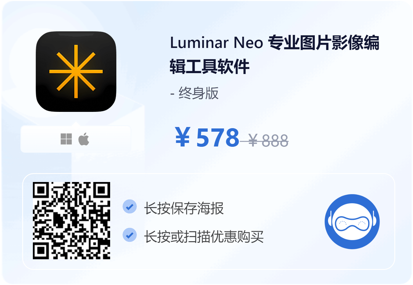 Luminar Neo 是一款适用于 macOS 和 Windows PC 的照片编辑软件,以 AI 驱动为核心,提供多种功能如替换天空、增强风景和肖像等。它界面直观,支持图层、遮罩和局部调整等工具,可作为 Photoshop 和 Lightroom 插件使用,具备多种预设,能快速获得专业级效果。软件还支持多种文件格式和无损编辑,满足不同用户需求。腾龙工作室网站用户专属优惠:终身版仅需 578 元!立即购买:https://apsgo.cn/59cXjR