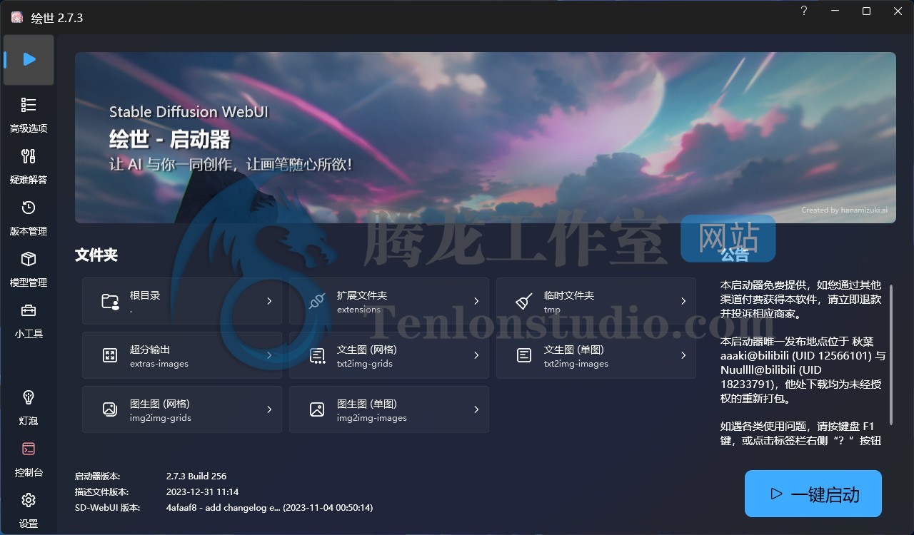 Stable Diffusion是2022年发布的深度学习文本到图像生成模型。它主要用于根据文本的描述产生详细图像,尽管它也可以应用于其他任务,如内补绘制、外补绘制,以及在提示词指导下产生图生图的转变。它是一种潜在扩散模型,由慕尼黑大学的CompVis研究团体开发的各种生成性人工神经网络之一。它是由初创公司StabilityAI、CompVis与Runway合作开发,并得到EleutherAI和LAION的支持。最新一次更新整合包版本v4.9,24 年 8 月更新。 本整合包支持SDXL,预装多种必须模型。无需安装git、python、cuda等任何内容,无需任何配置解压即用。