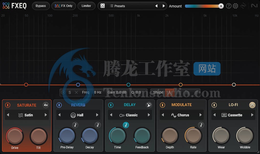 5 种强大的创意效果。1 种创新的 EQ 工作流程。轻松为您的音轨增添驱动力、维度和质感。告别复杂的路由、总线和发送——相当于将 10 个独立插件合二为一,简化您的效果链。轻松体验精彩音效。使用 Saturate 为您的声音注入活力。使用 Lo-Fi 增添复古气息。使用合唱、镶边、移相、混响和延迟塑造深度和动感。然后,使用独特的组合和自动化功能,将任何声音扭曲成全新的效果。从浑厚的低音到清脆的鼓声,再到褪色的合成器音色,在您需要的地方注入创意从未如此简单。FXEQ 不仅仅是“应用”效果。使用每个模块的 6 段均衡器,为您的混音增添音色和质感。然后,使用 4 种多功能滤波器形状和可调 Q 值进行调整。告别常见的多重效果器,这是一种塑造声音的全新方式。8 种饱和度模式,赋予声音冲击力、个性和质感。想要人声略显温暖?想要低音部分呈现尖锐的失真效果?您可以选择大、小或介于两者之间的饱和度。