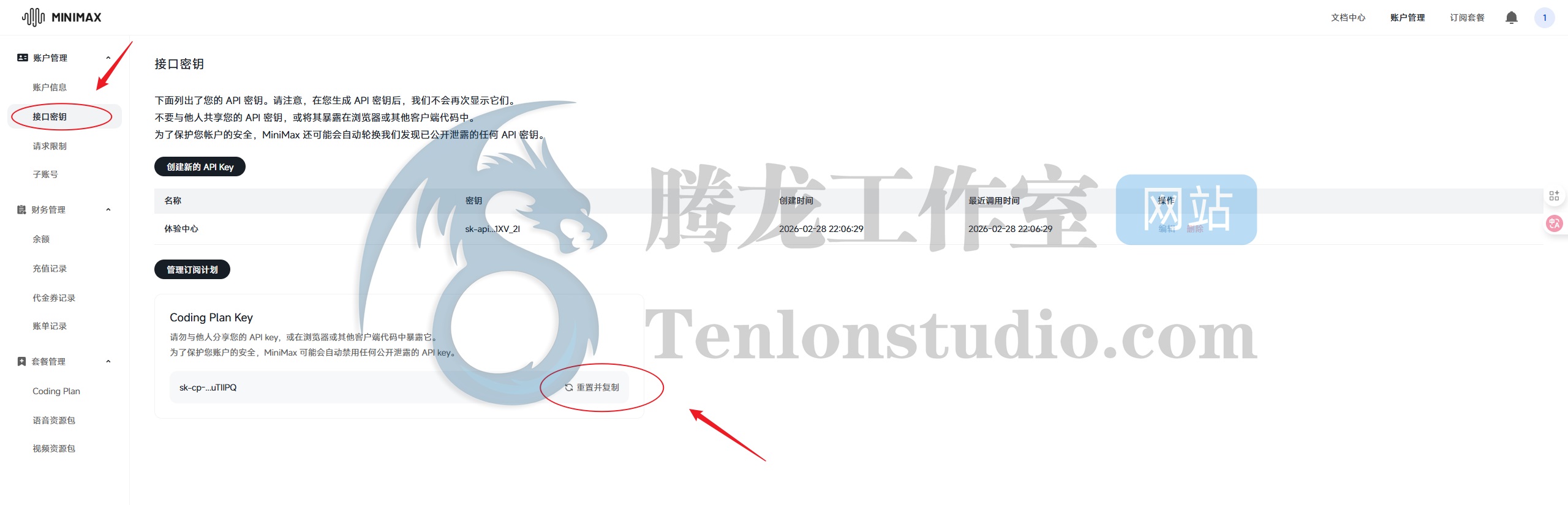 访问 MINIMAX 官网:https://minimaxi.com 注册账户并实名认证。找到【账户管理】-【接口密钥】-【Coding Plan Key】-【重置并复制】。