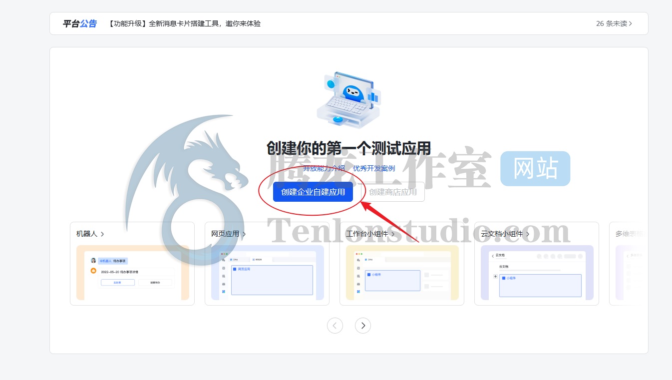 这里先到飞书开放平台:https://open.feishu.cn 注册并登录后台,创建企业自建应用。
