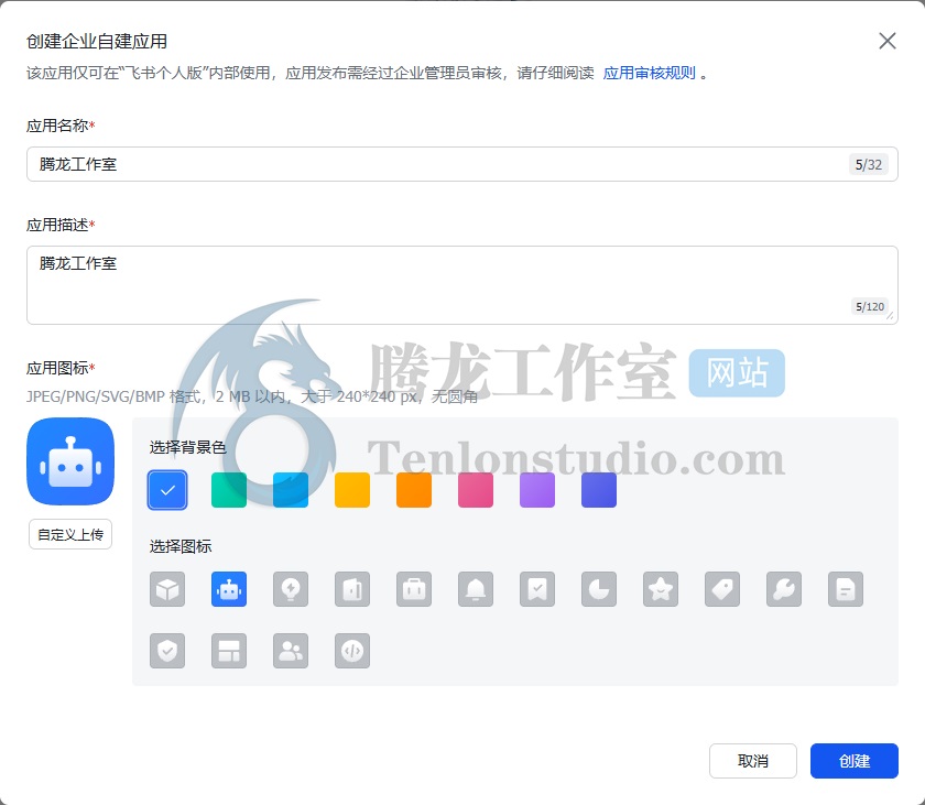 这里设置下【应用名称】【应用描述】【应用图标】后创建。