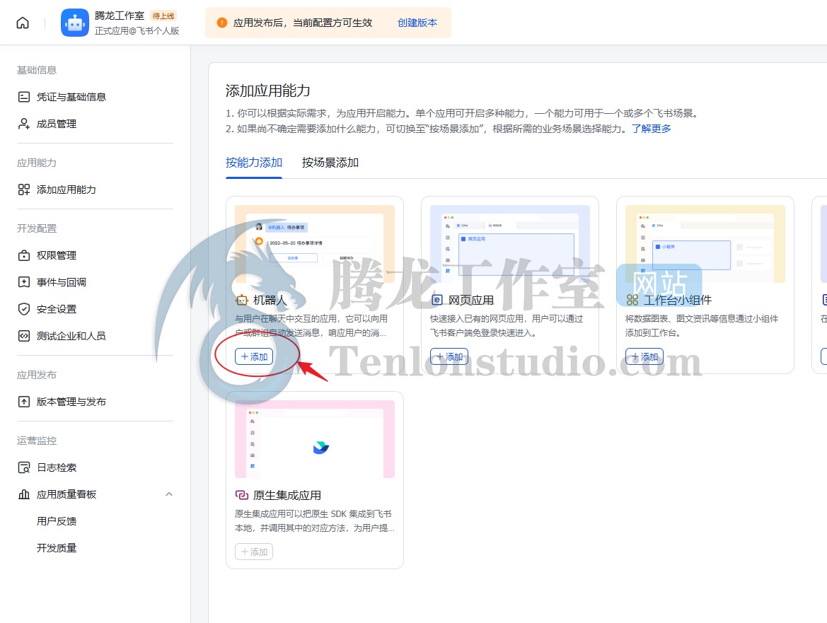我们继续配置飞书机器人,【添加应用能力】选择【机器人】添加。