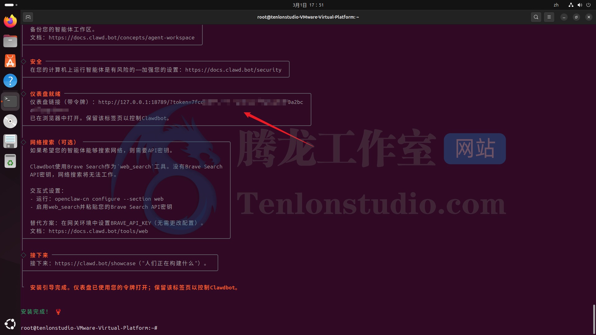 稍等片刻,安装完成!这时会给一个仪表盘的链接,先记下来。