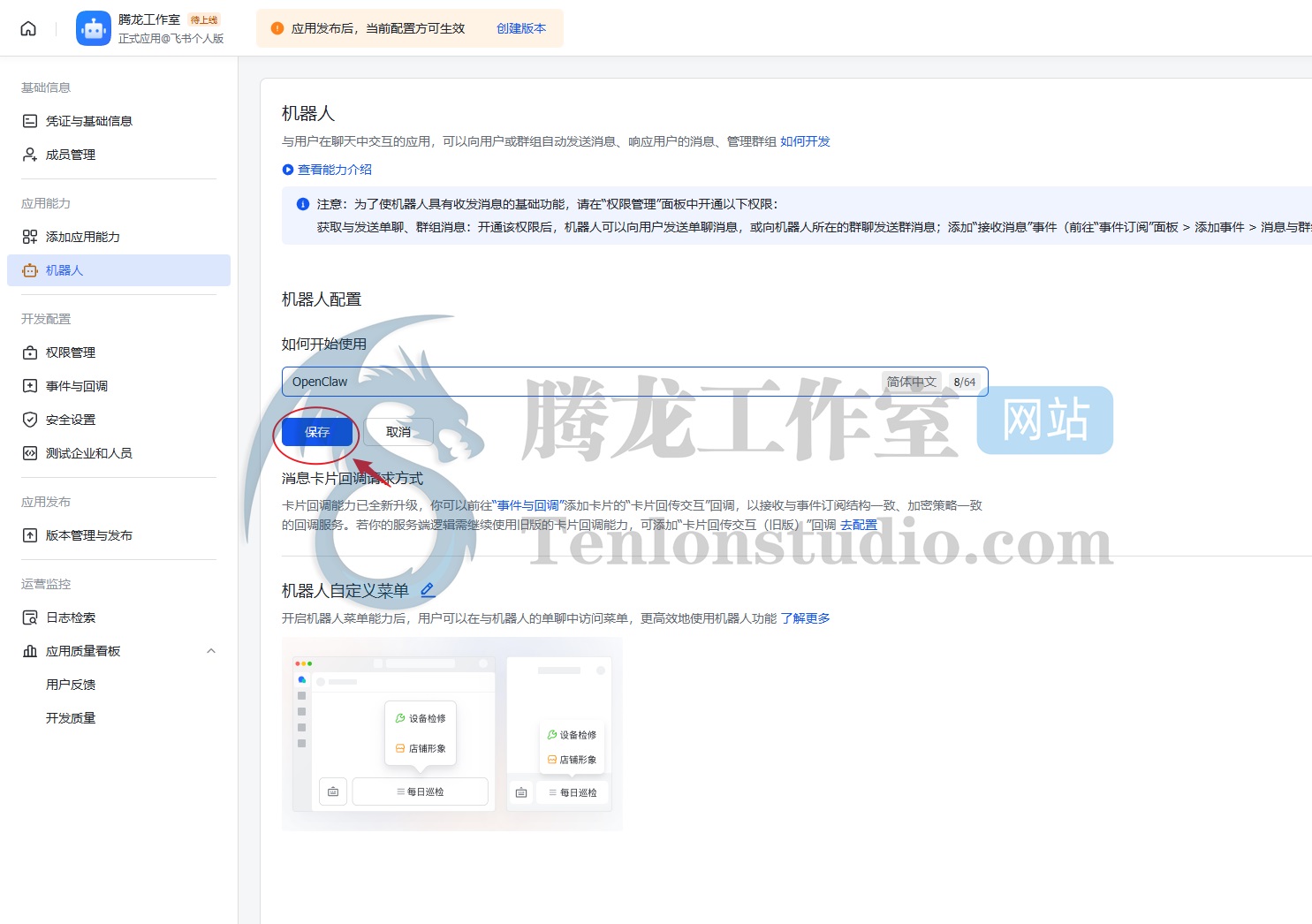 配置机器人名称后保存。