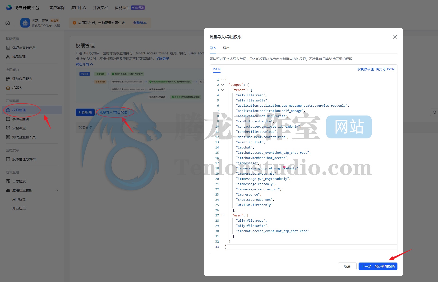 【权限管理】-【批量导入导出权限】粘贴如下内容确认: