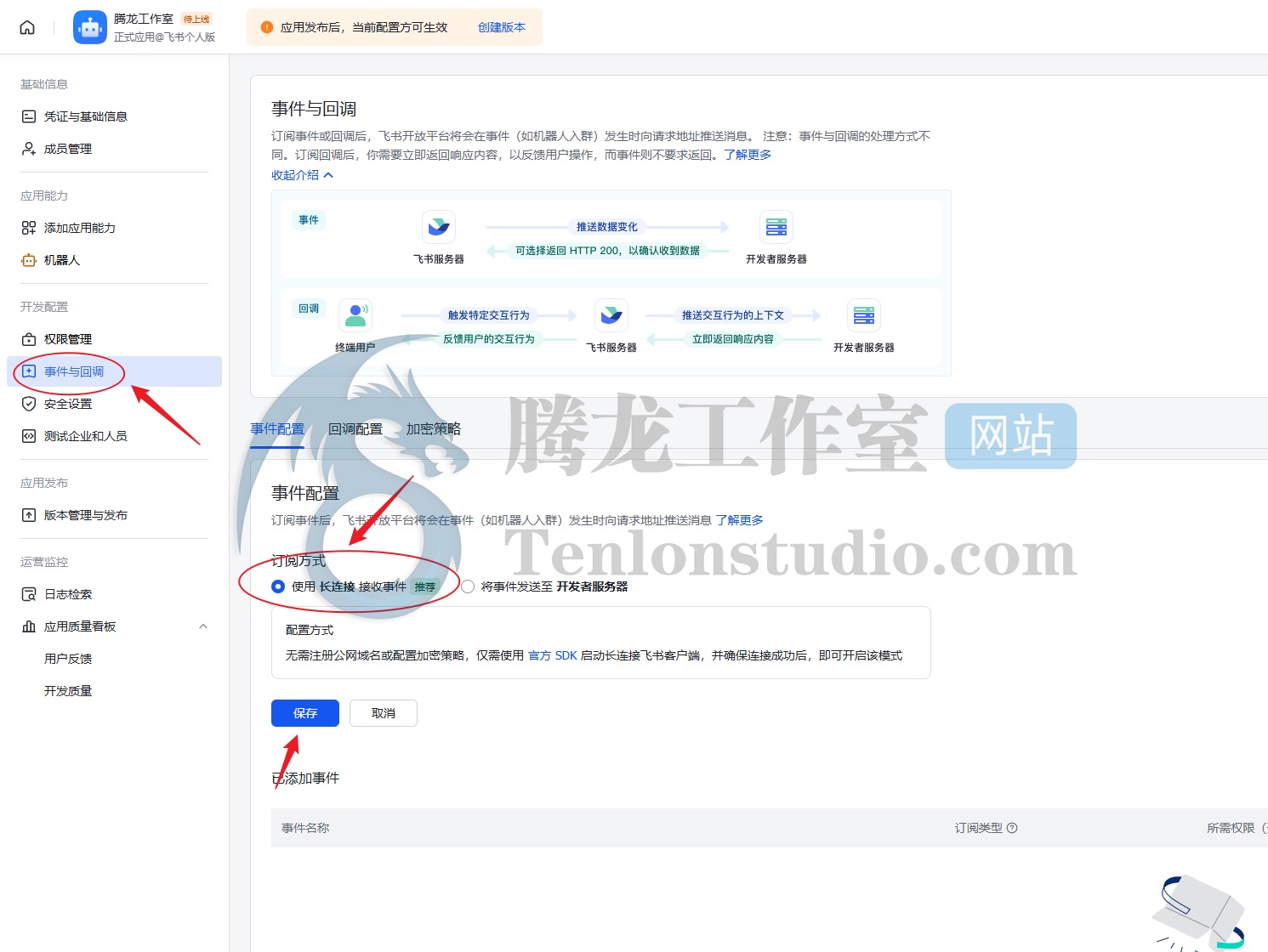 【事件与回调这里】选择【使用 长连接 接受事件】,