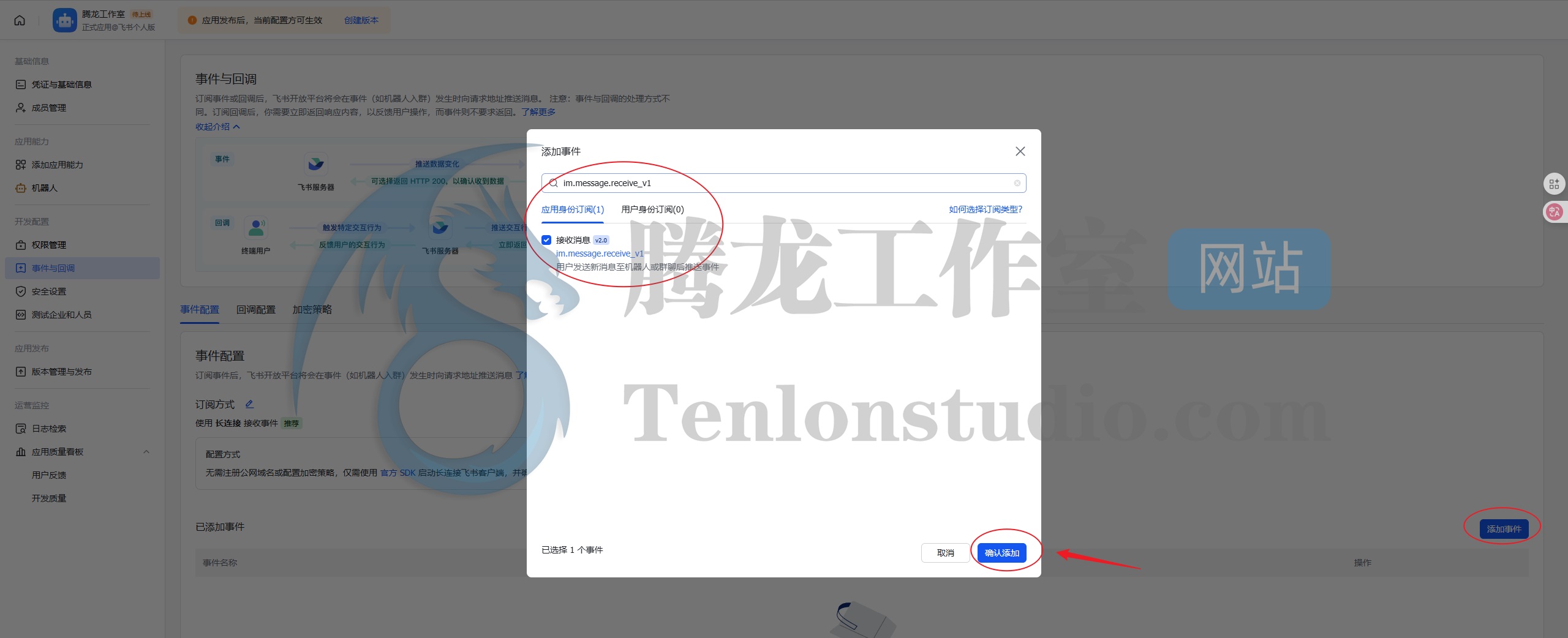 添加事件:im.message.receive_v1。