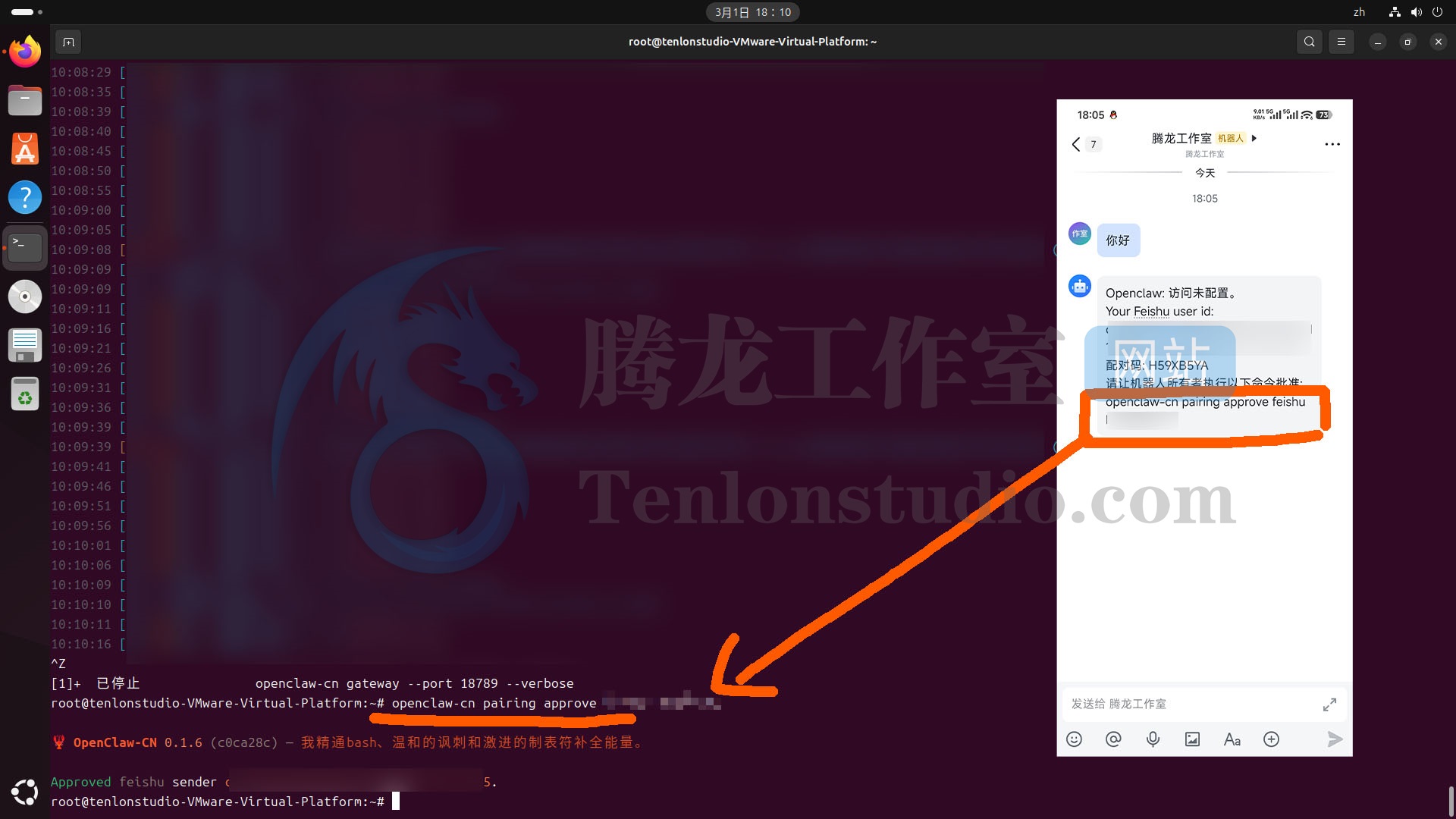 这时后我们用手机飞书,找到我们创建的机器人,发个你好,然后 Ctrl+C 结束进程。将下边的命令复制到终端,回车即可完成配对。