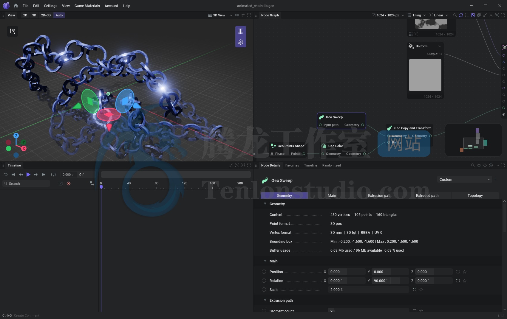 想象一下:你想制作一个火焰剑挥特效,需要同时创建 3D 模型和纹理资源。你需要一个弧形模型、一个用于去除硬边的遮罩以及各种风格化的平移噪波纹理。通常情况下,你会在一个程序中创建 3D 模型,然后在另一个程序中创建纹理。你会在两个程序之间来回切换,直到完成任务。而使用 IlluGen,你可以在一个图形界面中创建 3D 模型、遮罩和噪波。这样,你就可以在将所有资源添加到游戏之前,先进行创建和预览,了解它们之间的交互效果。
