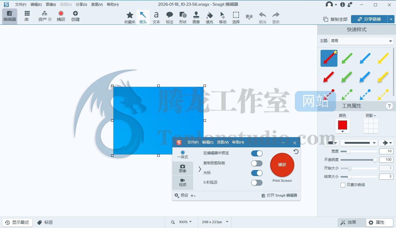 TechSmith Snagit 汉化版是一款功能强大的屏幕截图与录制工具,适用于办公教程制作、在线教学、产品演示、流程文档编写及多媒体内容创作。软件操作简便,即使是初学者也能快速上手,而高级用户可以通过丰富的功能实现专业级屏幕录制和图像编辑。