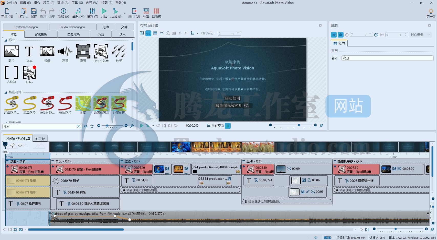 AquaSoft Photo Vision v17 是德国 AquaSoft 公司开发的一款多功能创意视频与幻灯片制作软件,主要用于将照片、视频、文字和音乐组合成动态视觉作品。虽然它的名字带有 “Photo” (照片),但其功能已经远超传统幻灯片工具,可以看作是面向生活视频创作和展示的一种轻量级非线性编辑解决方案。软件支持直观的时间轴与故事板视图,通过拖放即可创建复杂的动态画面效果。