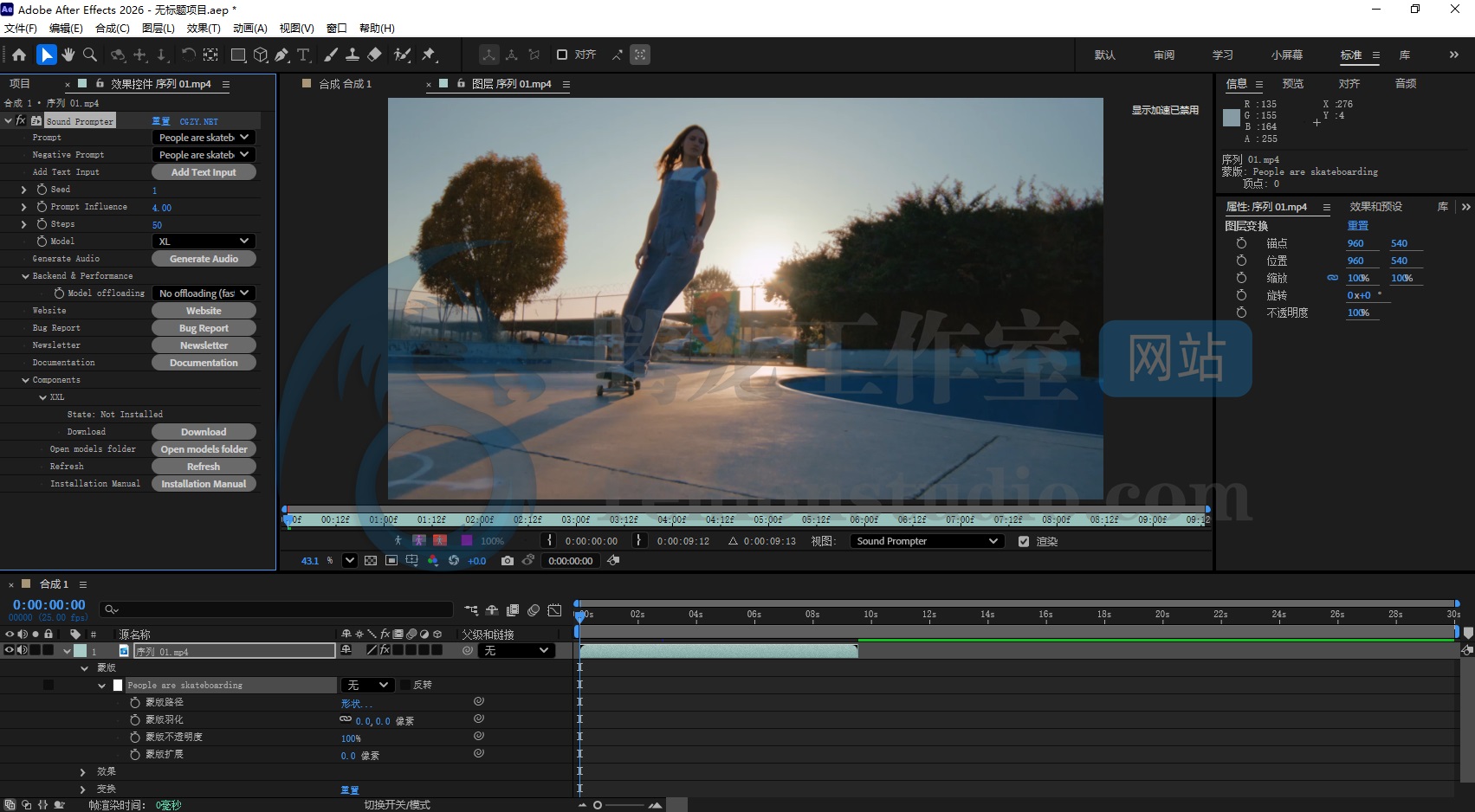 Sound Prompter 的优势在于它将 AI 驱动的声音生成 与视频后期紧密结合,通过视觉提示和自然语言提示,让音效设计变得更加直观和高效。尤其对需要快速制作配乐、环境音或动作音效的项目来说,这种自动化流程大大节省了时间,是 After Effects 用户探索 AI 音频创作的一种新选择。