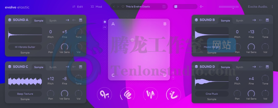 Excite Audio Evolve Elastic 是一款以“声音形变”为核心理念的采样合成器插件,主要面向电子音乐制作人和声音设计师。它的设计思路并不是还原真实乐器,而是通过极端调制与多层结构,将声音不断扭曲、拉伸和重构,生成具有未来感和实验性质的音色。