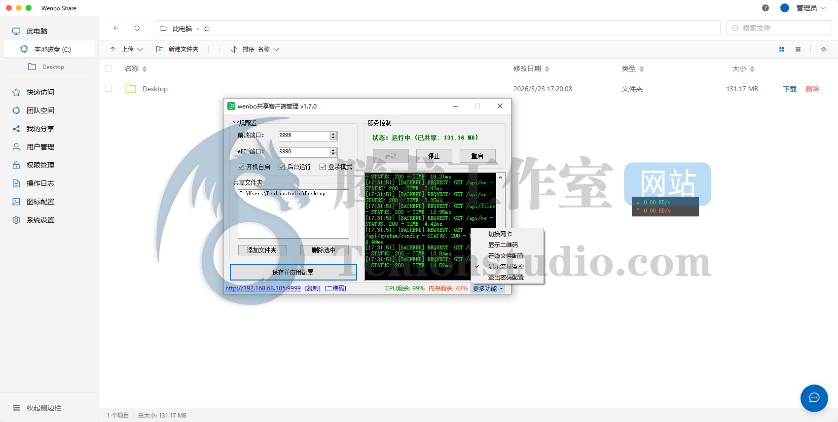 Wenbo Share 是一个面向局域网环境的文件共享工具,核心目标是让同一网络下的设备之间可以更方便地进行文件传输与访问。它更接近于一个轻量级私有云或临时共享系统,通过在本地启动服务,将指定文件或文件夹开放给其他设备访问,从而实现类似“局域网网盘”的效果。