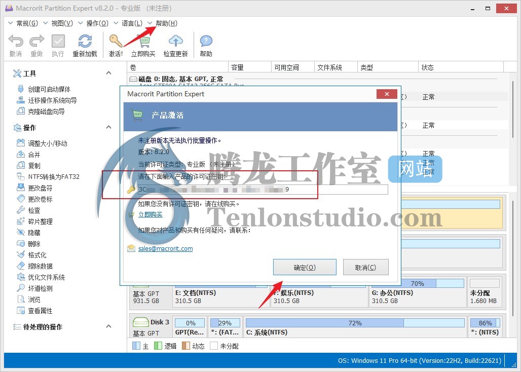 首先下载 Macrorit Partition Expert Pro 官方安装包并安装,安装完成后打开,点击【帮助】-【激活】,输入本站提供的许可码后点击【确定】即可。