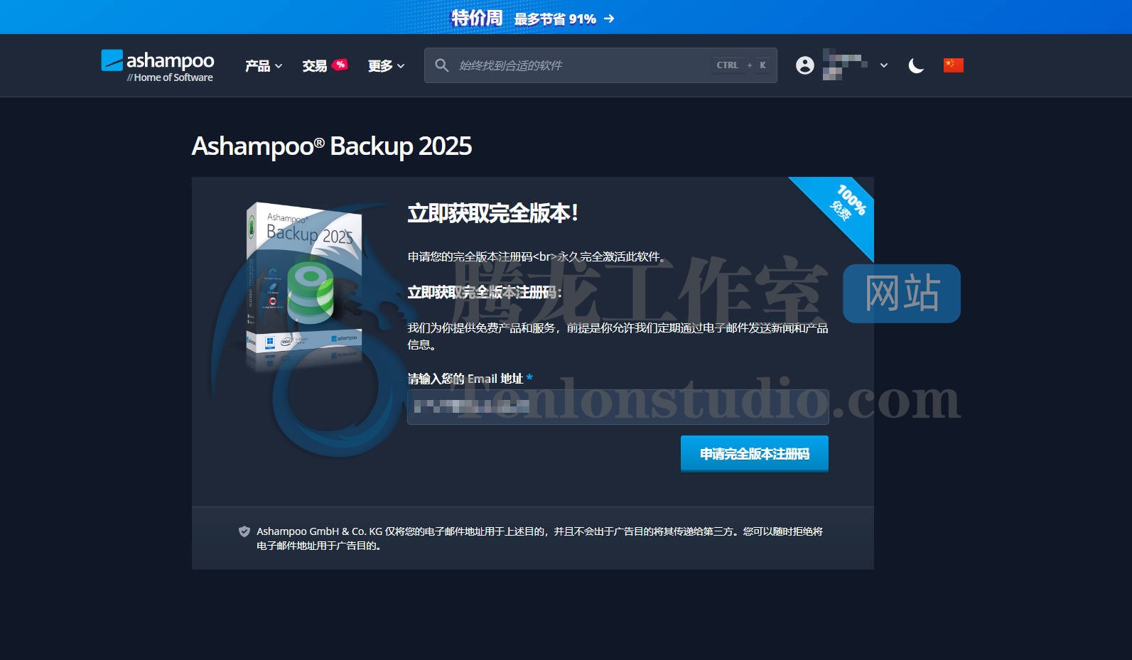 打开注册码获取链接,输入您的邮箱账号,点击【申请完全版本注册码】按钮。完成邮箱验证后可以获得 Ashampoo Backup 完全版本的注册码。