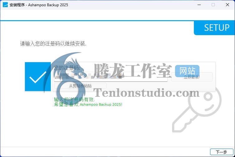 到官方网站下载 Ashampoo Backup Pro 的安装包,安装过程中就输入刚才我们获取到的注册码,并点击【立即激活】。验证通过后可以在右下角点击【下一步】按钮。