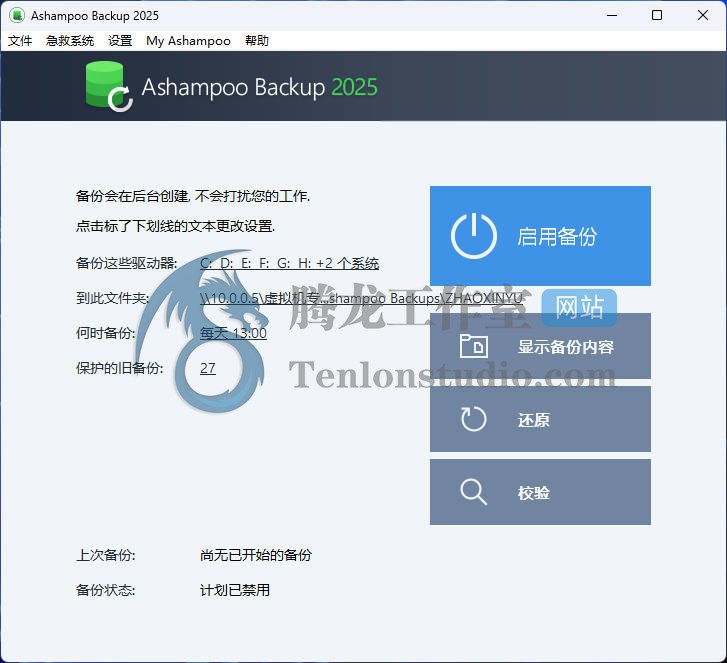 Ashampoo Backup Pro 26 是一款强大的 Windows 备份解决方案,旨在安全存储和恢复数据、分区和可启动的操作系统。它具有实时备份功能,立即捕获监控文件夹中的更改。在硬件故障、Windows 错误或恶意软件攻击的情况下,可以快速恢复数据。软件在后台运行,使用最少的资源高效维护系统性能。凭借四种压缩标准和强大加密,备份始终保持紧凑且安全,防止未经授权的访问。腾龙工作室网站用户专属优惠:终身版仅需268元!立即购买:https://apsgo.cn/bNZ7O4
